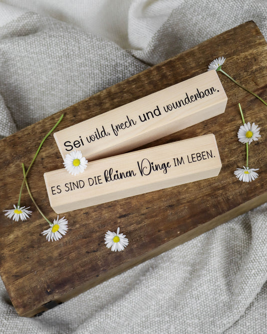 2er Set Foto- und Kartenhalter aus Zirbenholz - mit Sprüchen "Sei wild, frech und wunderbar" & "Es sind die kleinen Dinge im Leben"