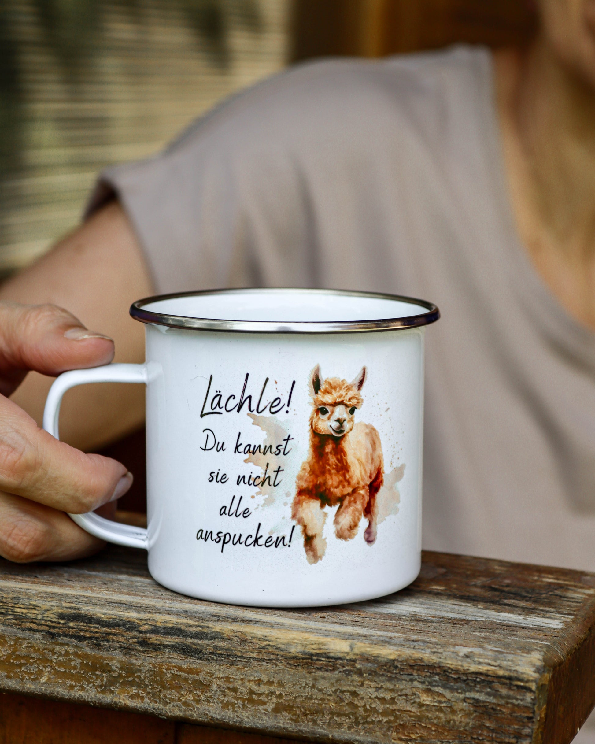 Lustige Emailletasse mit Alpaka-Motiv und Spruch "Lächle! Du kannst sie nicht alle anspucken!"